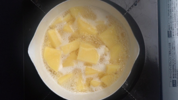 (2)鍋に(1)のいもと、いもがかぶるくらいの水を入れて中火にかけ、煮立ったら弱火でさらに7~8分煮込む。