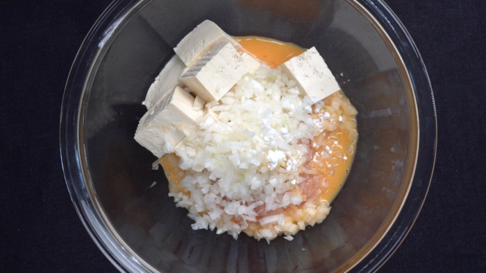 (3)鶏ひき肉と水を切った木綿豆腐、(2)の玉ねぎをボウルに入れ、塩、ナツメグを加えて肉だねを作る。