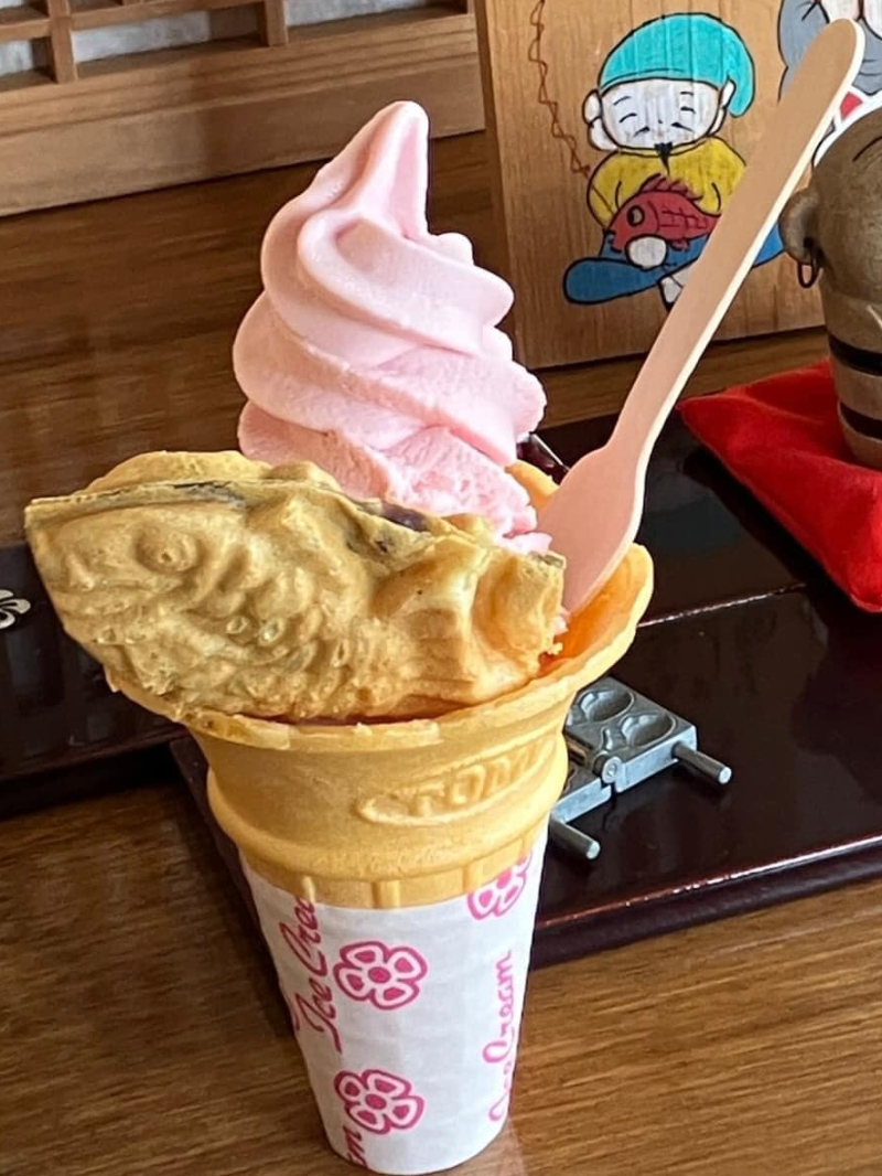 店内ではたい焼きを焼く様子を見られるほか、ミニたい焼きがのったソフトクリームやかき氷などのメニューも人気です。この地域に根付いた伝統の味をぜひお試しください。
