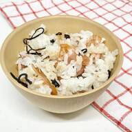 器にごはんをよそい、かつお節と炒りごまを混ぜ込みましょう。