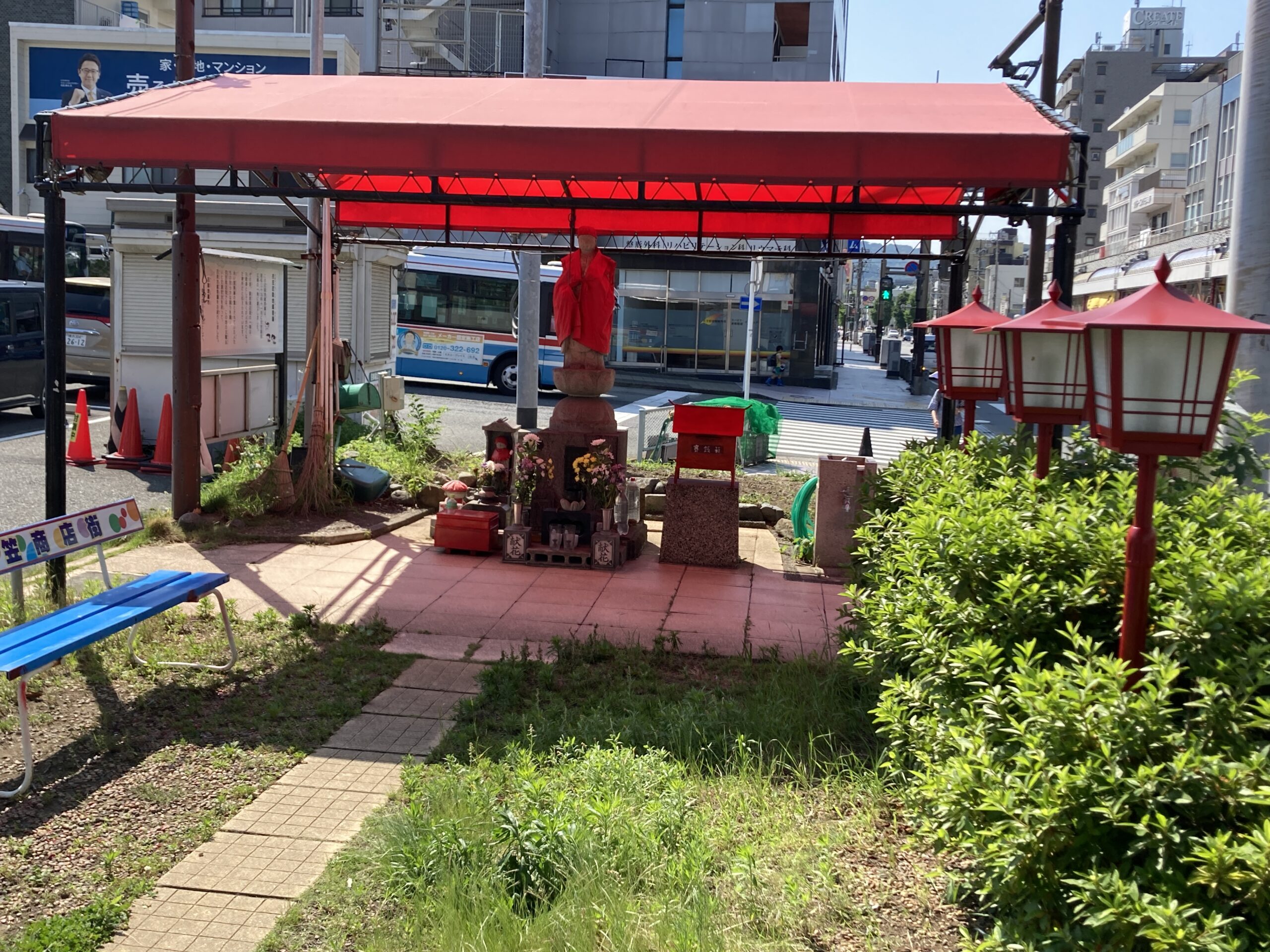 この辺りは、古くから三浦一族ゆかりの地とされており、その昔、駅前商店街の一帯は、古戦場として多くの人が亡くなった場所だと伝えられています。永い間無縁の霊とされていた人たちの安らかな眠りを願い、衣笠商店街では、この地の災難払いと交通安全を祈って、1964年に厄除地蔵菩薩が広場の一角に建立されました。