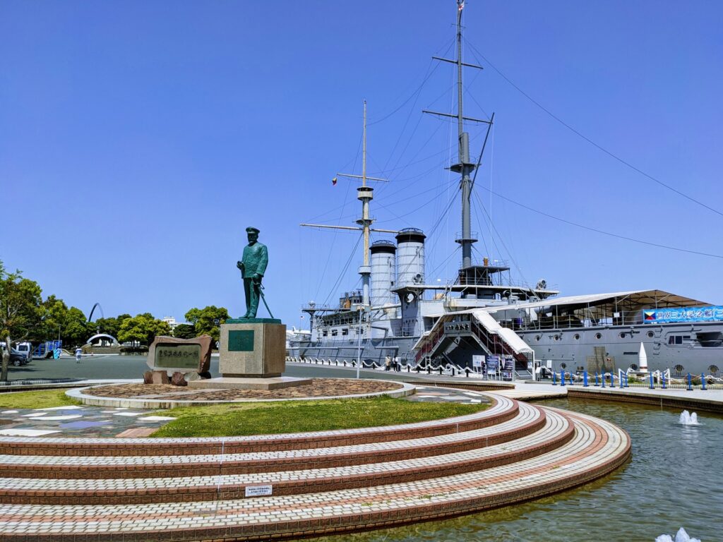 横須賀中央駅に到着。観光案内所でパンフレットを手に、海風に向かって三笠公園へ──徒歩約15分で記念艦「三笠」に到着。