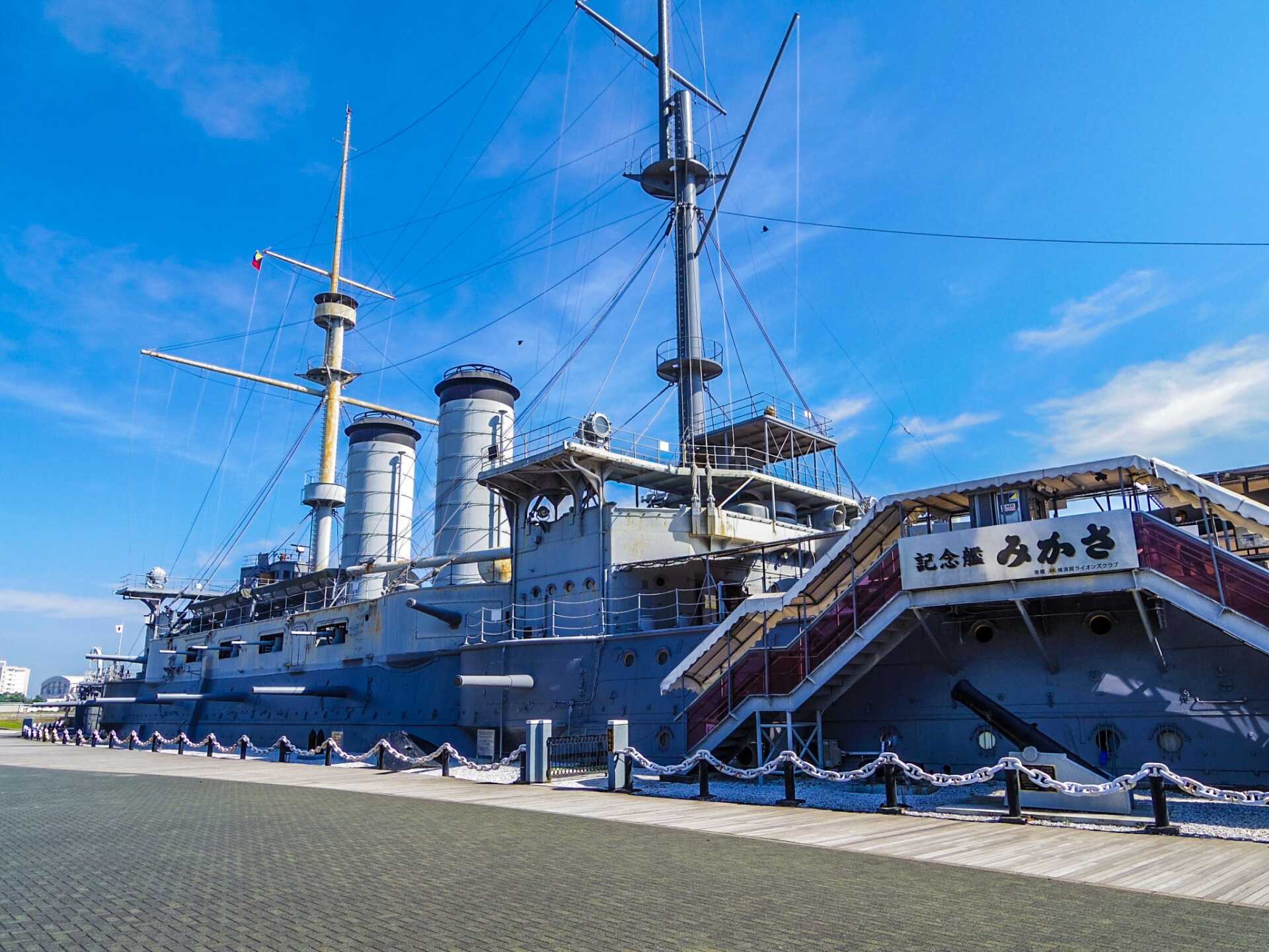 日露戦争で日本海海戦を戦った旗艦「三笠」は、現在も横須賀の海辺に雄姿をとどめる歴史遺産。艦内は一般公開されており、艦橋や主砲、士官室など細部まで丁寧に保存されています。
