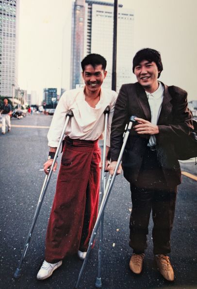 ▲『孔雀王 アシュラ伝説』香港公開版では、ユン・ピョウが孔雀を、阿部寛がコンチェを演じたバージョンが公開されている。『孔雀王』の製作中に、筆者は悪性肉腫で左足を一部切除し松葉杖に。ユン・ピョウは撮影の最初の段階のアクション・シーンで、骨折。日本での撮影時の変なツーショットとなった。