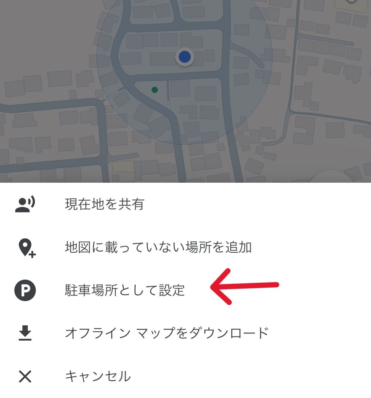 車を停めた場所で「Googleマップ」のアプリを開いて現在地を示す青い点をタップします。表示されるメニューから、「駐車場所として設定」を選びましょう。