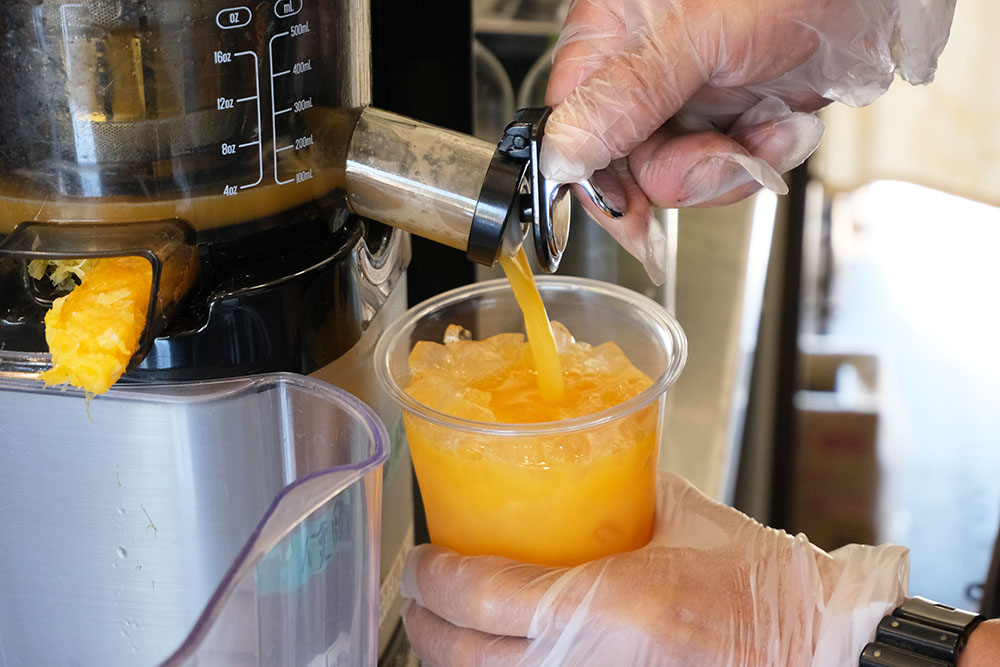 主井(ぬしい)農園が手がけるカフェでは、自社農園で採れた柑橘を使った「生搾りジュース」(650円)を提供。オーダー後にジューサーで搾る、サラリとした口当たりとすっきりした味わいが特徴の一杯です。
