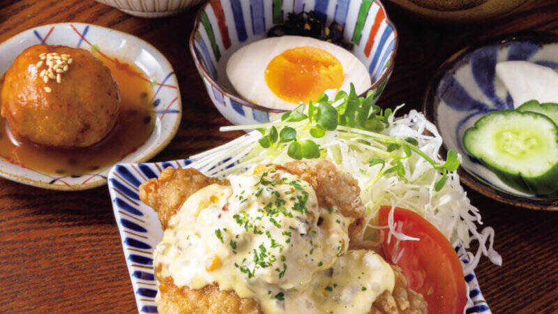 ランチのコンセプトは“毎日食べたい!おいしい健康食”。メニューは2種類あり、定番で柔らかいトロトロの牛すじと豆腐がのった丼がメインの「牛すじ煮込みごはん」(1,100円)と週替わり(予定)から選べます。取材時の週替りは「鶏三昧定食」(1,100円)でした。