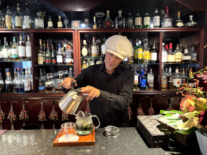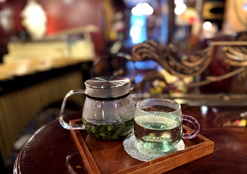 おすすめメニューは、ハーブティー。画像の「ブルーダンシング」(900円)は、リフレッシュ効果や喉のケアが期待できる3種類のハーブをブレンド。淹れたては鮮やかなブルーですが、時間の経過とともに美しいグリーンへと変化します。たっぷり2杯分をポットで提供してくれるのもうれしいです。