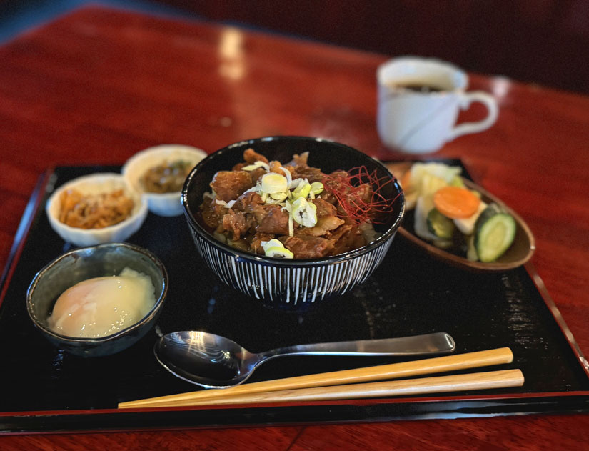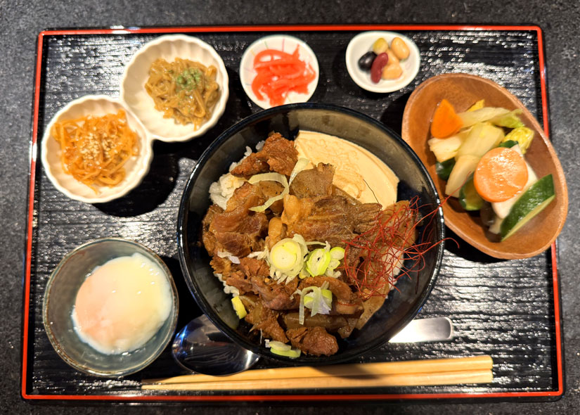 厳選した国産牛すじを2日間かけてじっくり煮込んだ丼に、副菜2品と大豆、漬物がセットになっています。漬物はぬか漬けと塩漬けの2種類が添えられ、たっぷりサイズなのもうれしいポイント。