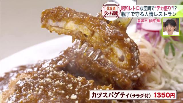 『カツスパゲティ(サラダ付) 1,350円(税込)』は、パスタの上に大きなトンカツ、自家製ミートソースがたっぷりかかった一皿。