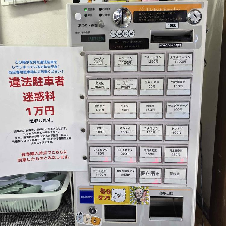 食券機には麺の量が書かれていてとても親切です。一般的なラーメンの量が食べたい方は『ミニ』、大盛りを食べたい方は『少なめ』を注文してください。今回わたしは一般的なラーメンの2倍以上の量がある『ラーメン』を注文。