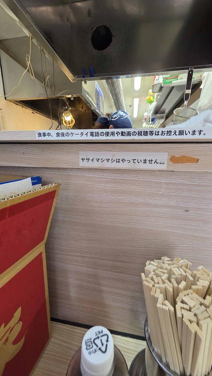 カウンターには卓上調味料、胡椒、一味唐辛子、ラーメンタレが置いてあります。お好みで調整できます。カウンター上にヤサイマシマシはできないと書いてありますので、ヤサイをもりもり食べたい方は食券でヤサイを注文されると良いと思います。ですが、初めての方は不可とのことで注意。