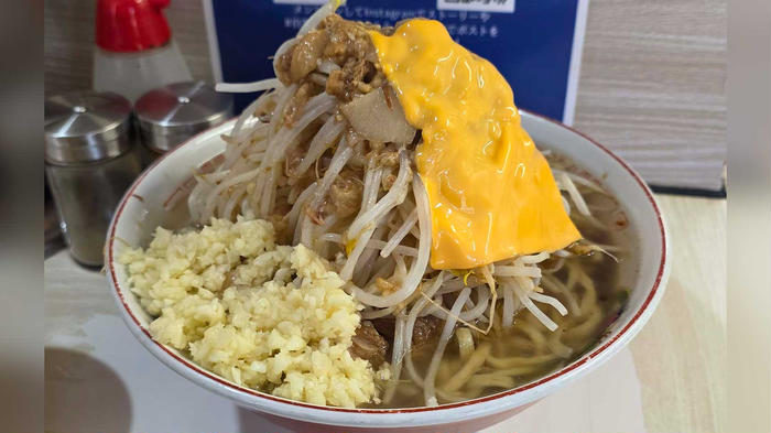 さらにトッピングに「チェダーチーズ」、「生たまご」、「ギルティ(高級トウガラシ、豚カス、アブラ、粗ニンニクが入ったトッピング)」、「ブタゴリラ(ブタカスがゴリゴリ入ったアブラ)」をチョイス。