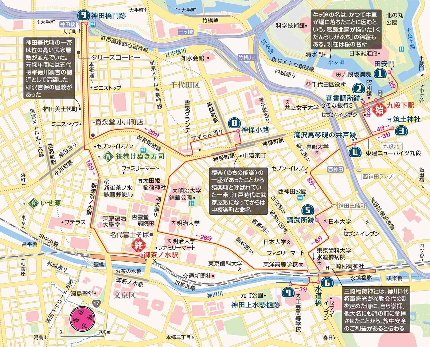 地下鉄東西線・半蔵門線・新宿線九段下駅→(2分/0.1㎞)→田安門→(3分/0.2㎞)→蕃書調所跡→(4分/0.3㎞)→築土神社→(3分/0.2㎞)→滝沢馬琴硯の井戸跡→(8分/0.5㎞)→講武所跡→(6分/0.4㎞)→水道橋→(3分/0.2㎞)→神田上水懸樋跡→(26分/1.7㎞)→神保小路→(20分/1.3㎞)→神田橋門跡→(18分/1.2㎞)→JR中央線・総武線・地下鉄丸ノ内線御茶ノ水駅