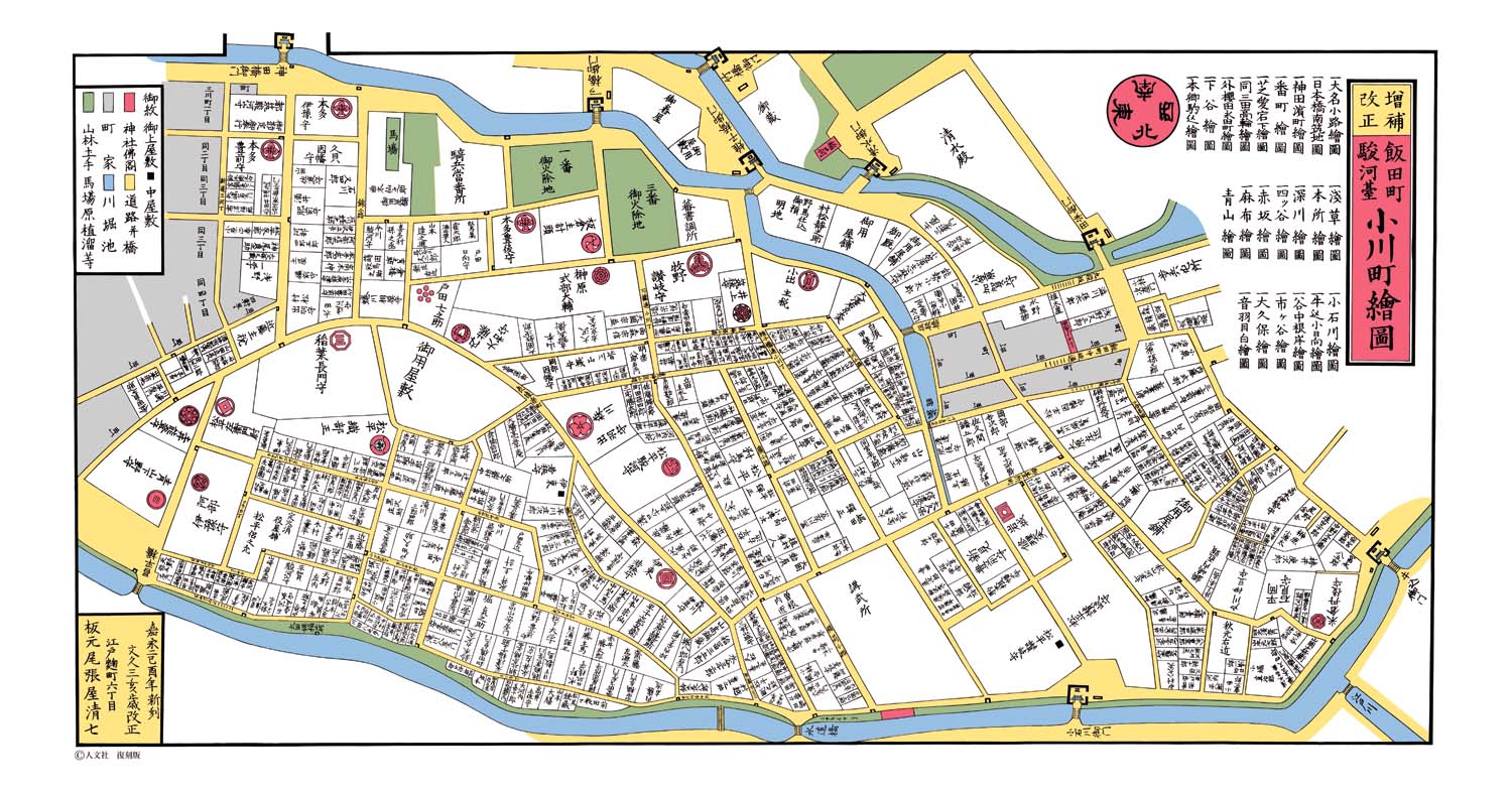 ※切絵図内の白色の部分は【大名屋敷などの武家地・御用地】、赤色は【神社仏閣】、灰色は【町屋】、黄色は【道】、青色は【海・川・池】、緑色は【山林・土手・馬場・田畑など】を示している。