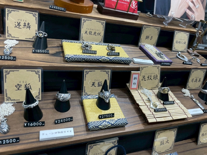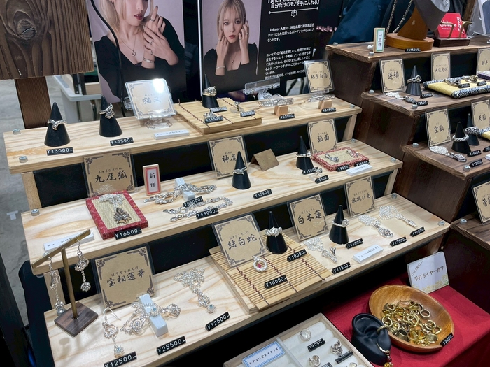アクセサリーブースからもう一店『kokonoe』さん。狐をメインモチーフにしている和風シルバーアクセサリーを制作されており、「経年変化するアクセサリーを楽しみ、自分だけの一点物を手に入れる」がコンセプト。