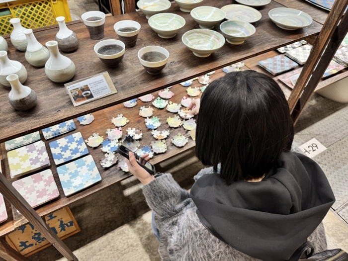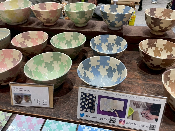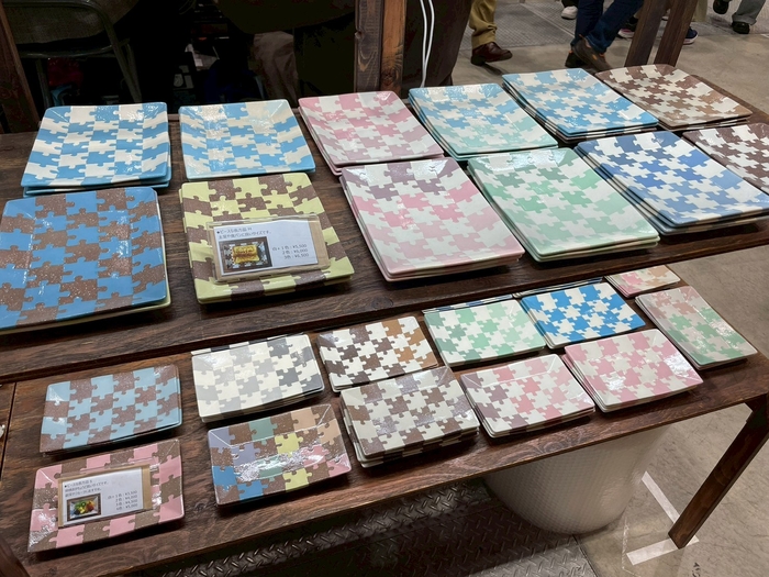 立体・工芸ブースにあった『アトリエ土窯日和』さん。ジグソーパズルと同じ様にピース1つ1つを組み繋げて制作した「ピースシリーズ」を中心に、異なる土を組み合わせて作った器やカラフルな器などの展示販売されていました。