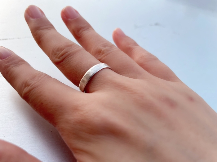 このリングは日本の地金屋さんに特注で作っていただいた質の良いシルバーだそうで、まぜものが少ないためつけていれば変色せず、そのまま日常生活できるもの。