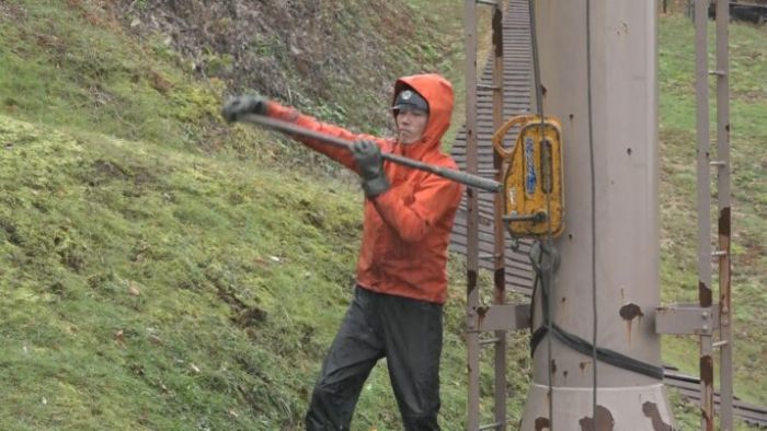 18日(火)は冷たい雨が降るなか、専門業者がリフトのロープを支える器具を10年ぶりに取り替えました。重さはひとつ60キロあり、作業員5人が慎重に作業を進めていました。