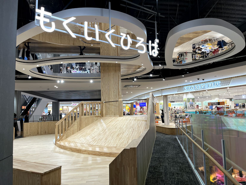 長野県産材を活用した子どもの遊び場「もくいくひろば」(対象:3~6歳)と「あそびノ場」(対象:0~2歳)があり、それを囲むようにベビー&キッズ用品の専門店が配置。さらに、「スターバックス コーヒー イオンモール須坂3階店」の隣には、北信五岳を望める子どもの遊びエリアと休憩スペース「北信テラス」があります。