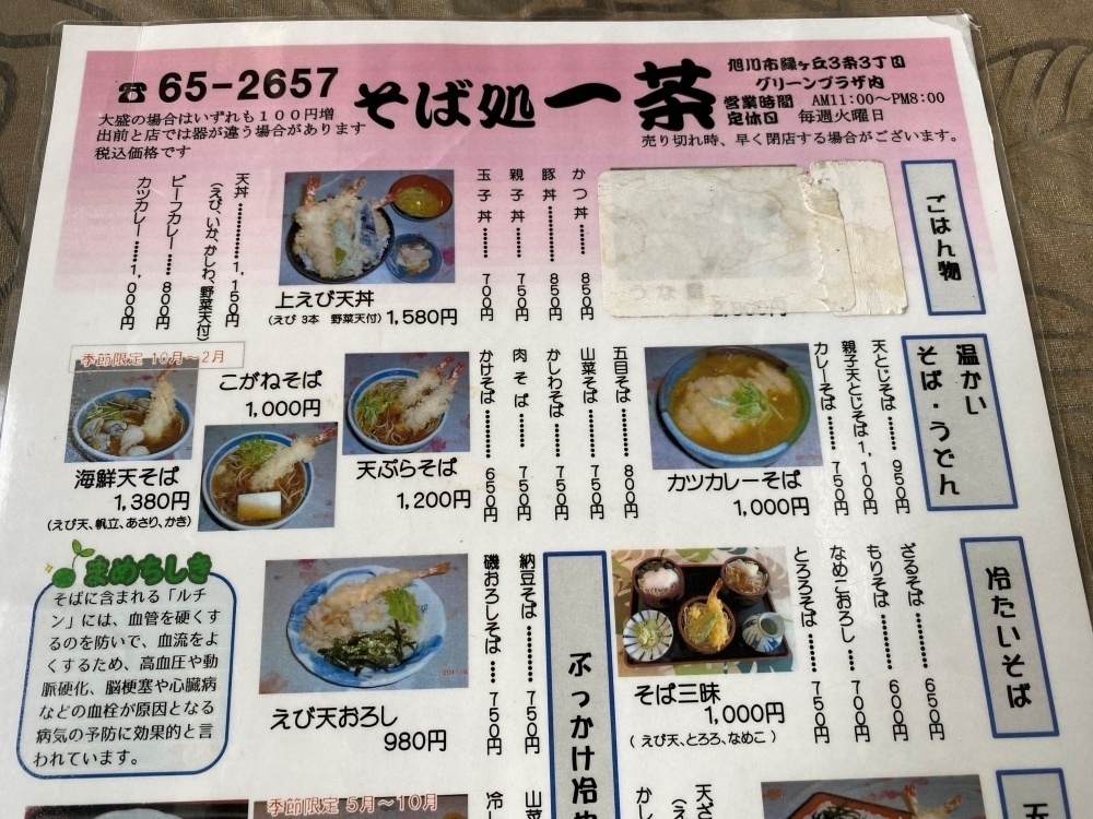 「そば処 一茶」は、もりそばが600円と庶民的なおそば屋さんで、お品書きにはそばやうどんの他、ごはん物、セットもの、お弁当、ラーメンなど豊富なメニューが並んでいます。