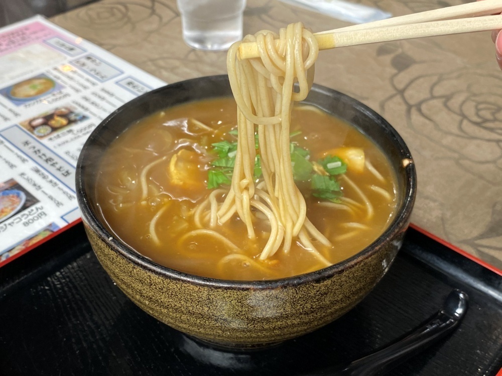 「そば処 一茶」のカレーそばは、程よいスパイシーさで、しょうゆと和風出汁の香りが絶妙なバランス。つゆのとろみで緩めでスルスルと食べられます。