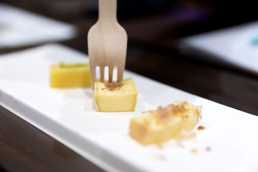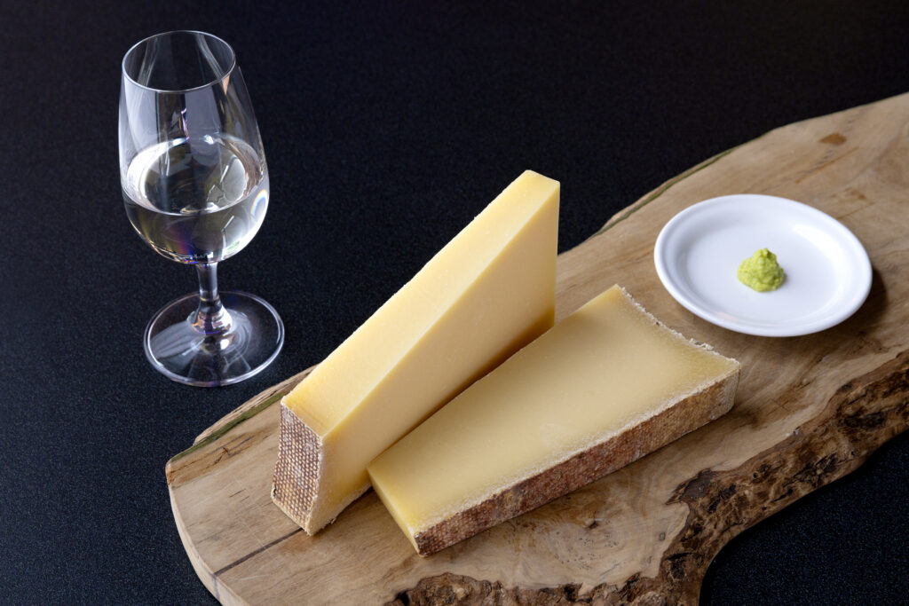 実際に体験してみると、わさびはやや多めにチーズの上にのせるのがポイント。ボーフォールの旨みとコクに、透明感のある辛味がふっと通り抜け、味に奥行きを加える。そこに純米吟醸を一口。やわらかな口当たりとフルーティな吟醸香が、ボーフォールの豊かな風味にすっと溶け込み、鼻に残るわさびの余韻とも美しく調和する。