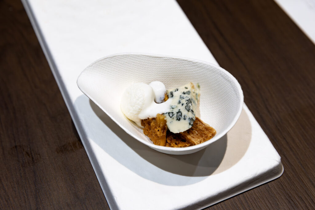 セミナーの最後を飾ったのは、甘さ、香ばしさ、コクの層が重なり合う、デザートのような一皿。主役は、青カビタイプの中でも穏やかな味わいが特徴の「フルム・ダンベール」。これに、冷たいミルクアイスとドライいちじく、そしてココナッツのクラッカーを組み合わせた。