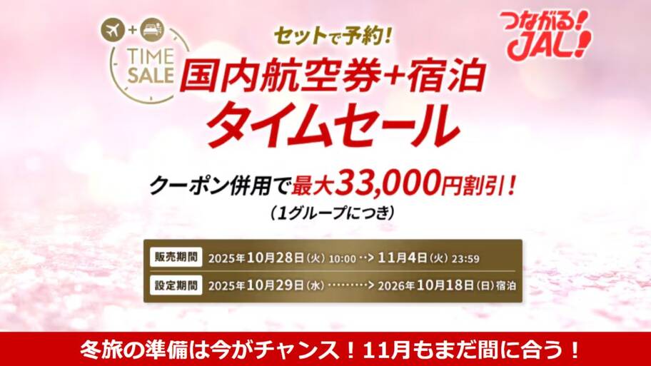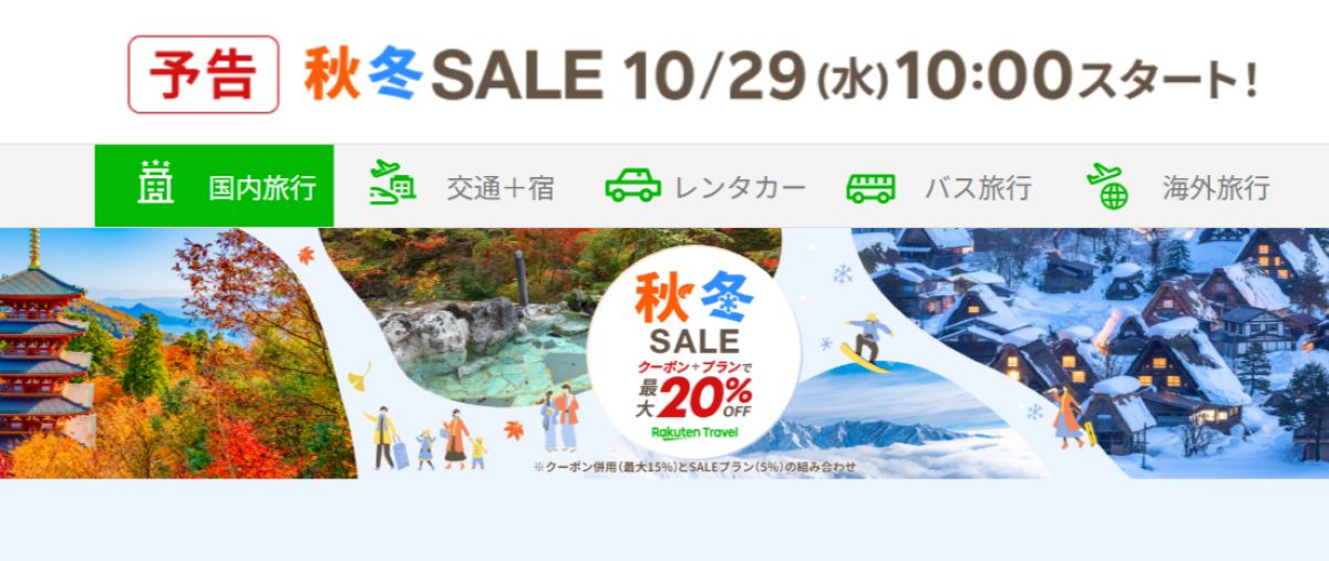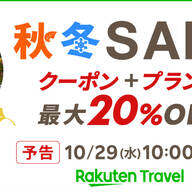 楽天トラベルでは、秋冬の旅行がお得になる「秋冬SALE」を2025年10月29日(水)10:00から開始します。国内旅行は最大20%OFF、海外ツアーには最大5万円クーポンが配布されるなど、11月15日(土)までの期間で、国内・海外ともに魅力的なセールが予定されています。その他にもレンタカー割引クーポンや、楽天モバイル契約者様向けの特典も用意されます。