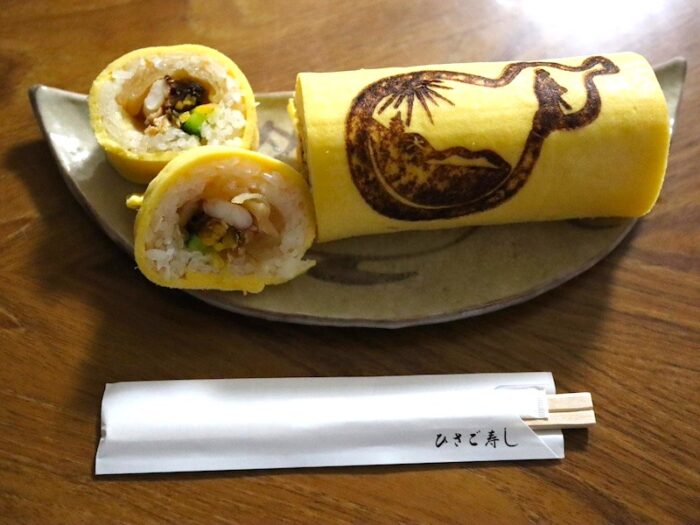 海苔の代わりに使われている錦糸玉子は、実は名物の『名代ちらし寿司』と同じものを使用。海苔を使わないことで口当たりが驚くほど柔らかく、お子さんからご年配の方まで食べやすい巻き寿司に仕上がっています。