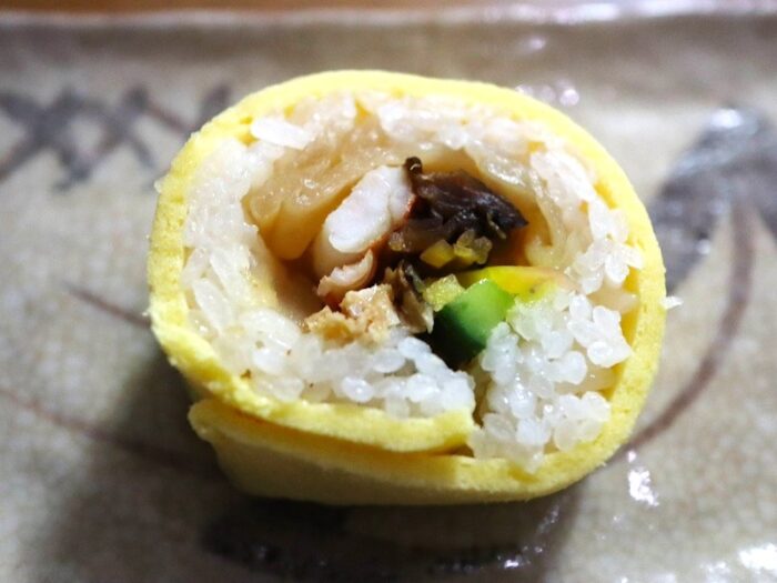 中には、椎茸、干瓢、焼穴子、海老、胡瓜、お新香といった彩り豊かな具材が。一口食べると、まず焼穴子の香ばしい香りがふんわり広がり、具材それぞれの味わいと、全体を包むほんのり甘い錦糸玉子が絶妙なハーモニーを織りなします。