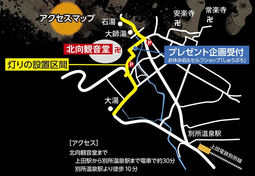 2026年1月17日(土)から2月1日(日)までの毎週土・日曜に、「北向観音堂参道(大門通り)」と「外湯(石湯~大湯)」で灯ろう・ボールライトが点灯するプレイベントを開催。灯ろうのデザインは上田短期大学の「別所がぁる&ぼぉい」が制作。