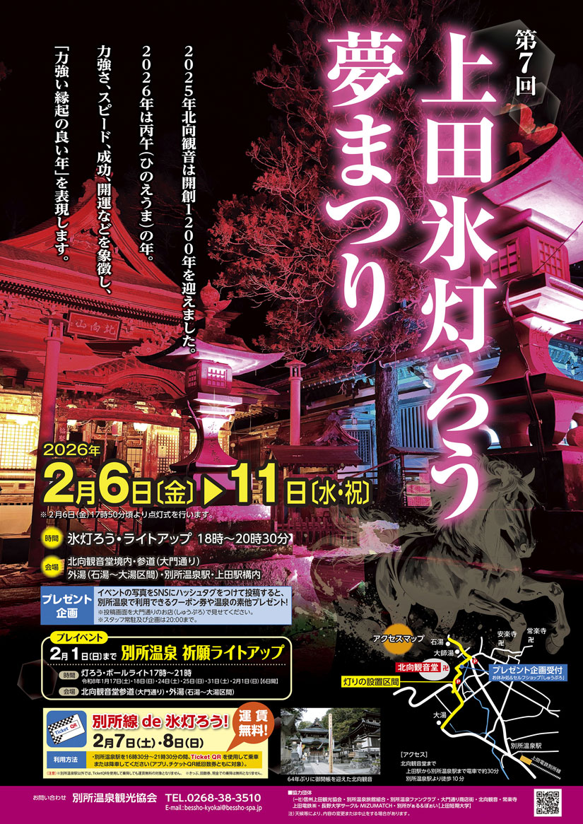 2026年2月6日(金)~2月11日(水・祝)に長野県上田市の別所温泉にある「北向観音堂」を中心に『第7回上田氷灯ろう夢まつり』が開催。2025年に開創1200年を迎えた歴史深い「北向観音堂」がライトアップ。また期間中は、参道や周辺の温泉街も氷灯ろう・ボールライトなどが点灯し、冬の温泉街が幻想的な雰囲気に包まれます。
