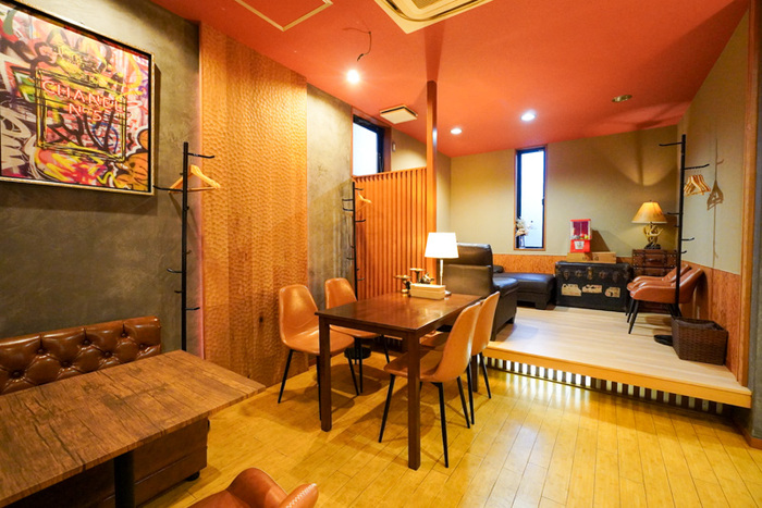 カウンター席とテーブル席、奥には小上がりソファ席もあり、一人でもグループでもゆっくりくつろげるのが魅力です。