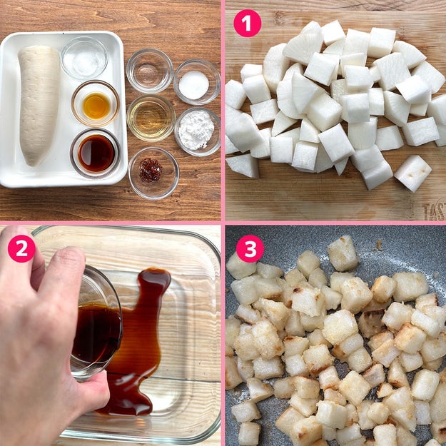 ① 大根は皮をむいて1cm角に切り、塩をもみ込む。10分置いたら水気をしっかりと絞り、片栗粉をまぶす。