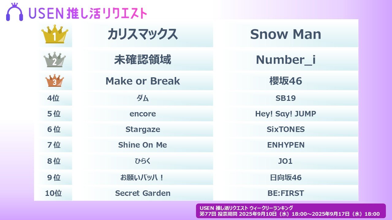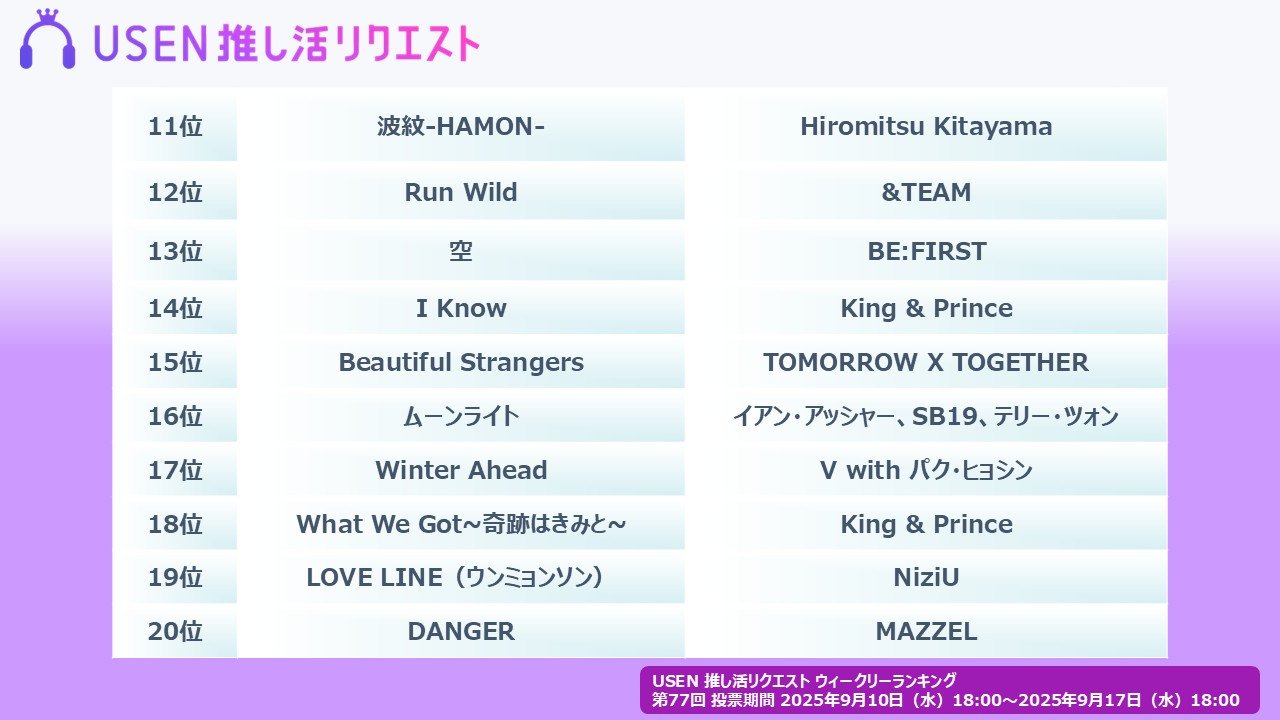 株式会社 U-NEXT HOLDINGSのグループ会社である株式会社 USENが運営する USEN 音楽配信サービスにおいて、だれでも参加できる楽曲投票サービス『USEN 推し活リクエスト』(以下、推しリク)における楽曲リクエスト(投票)をもとに 2025年 9月10日(水)より集計した『USEN 推し活リクエストランキング』の第77回「ウィークリーランキング」を発表。2025年9月20日(土)よりウィークリーランキング番組の配信が開始となる。