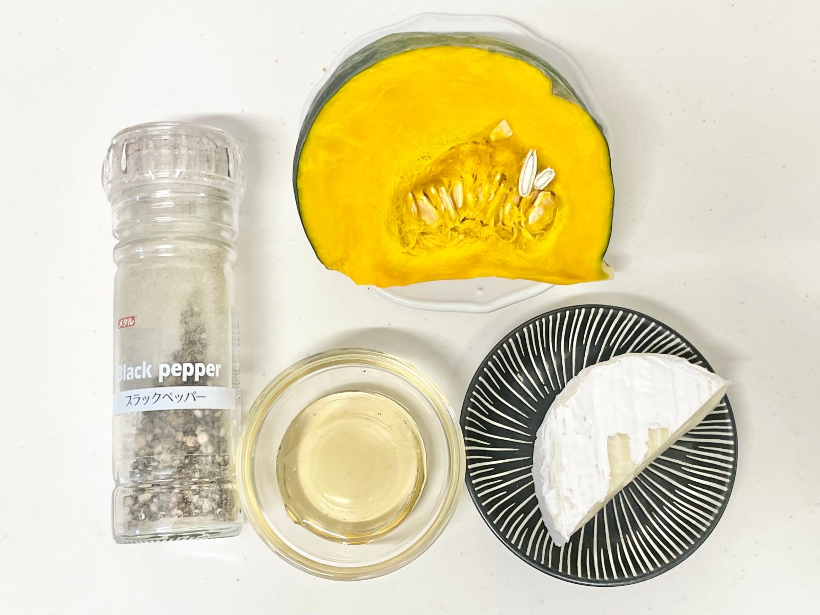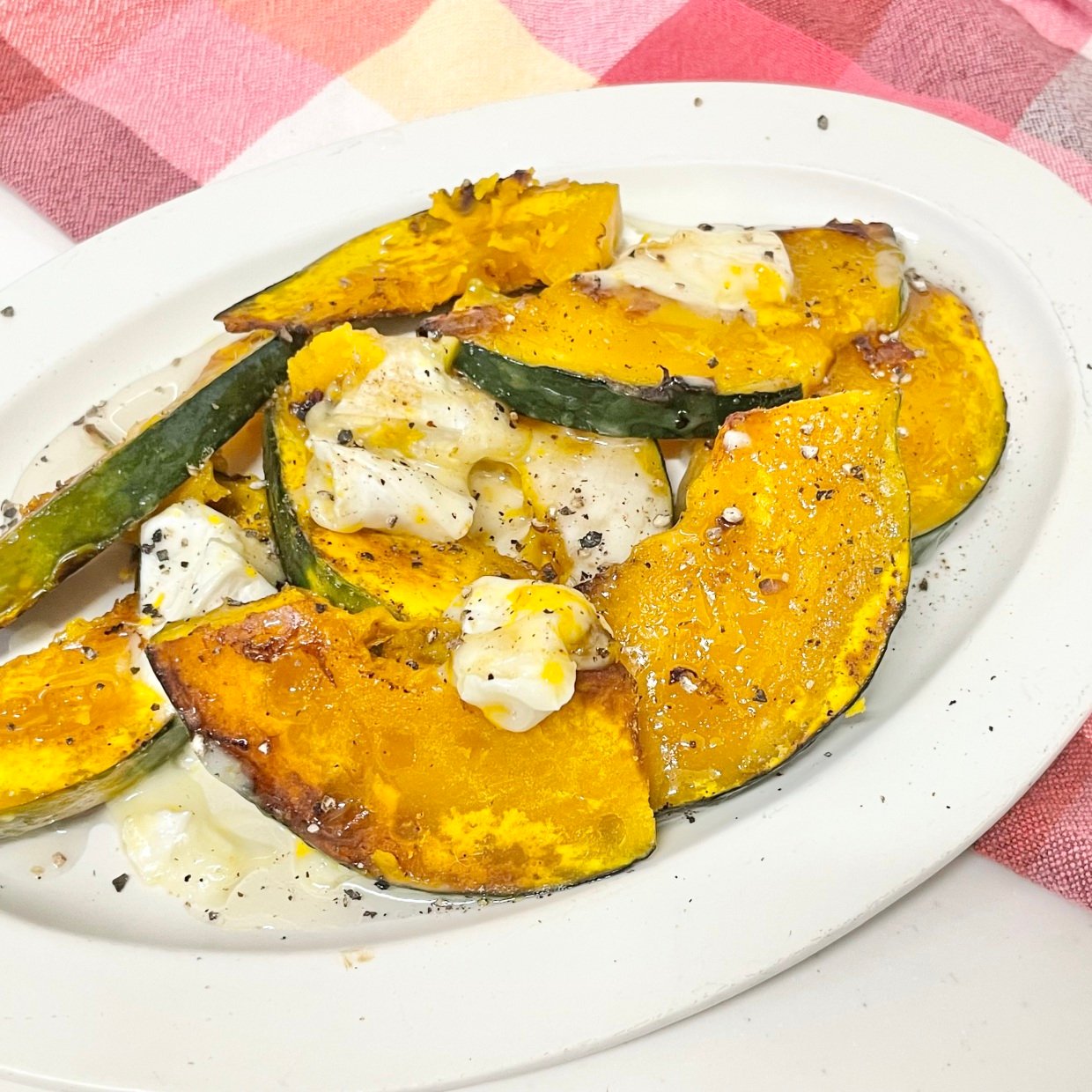 かぼちゃとカマンベールチーズを焼いたらはちみつとブラックペッパーをかけるだけ。