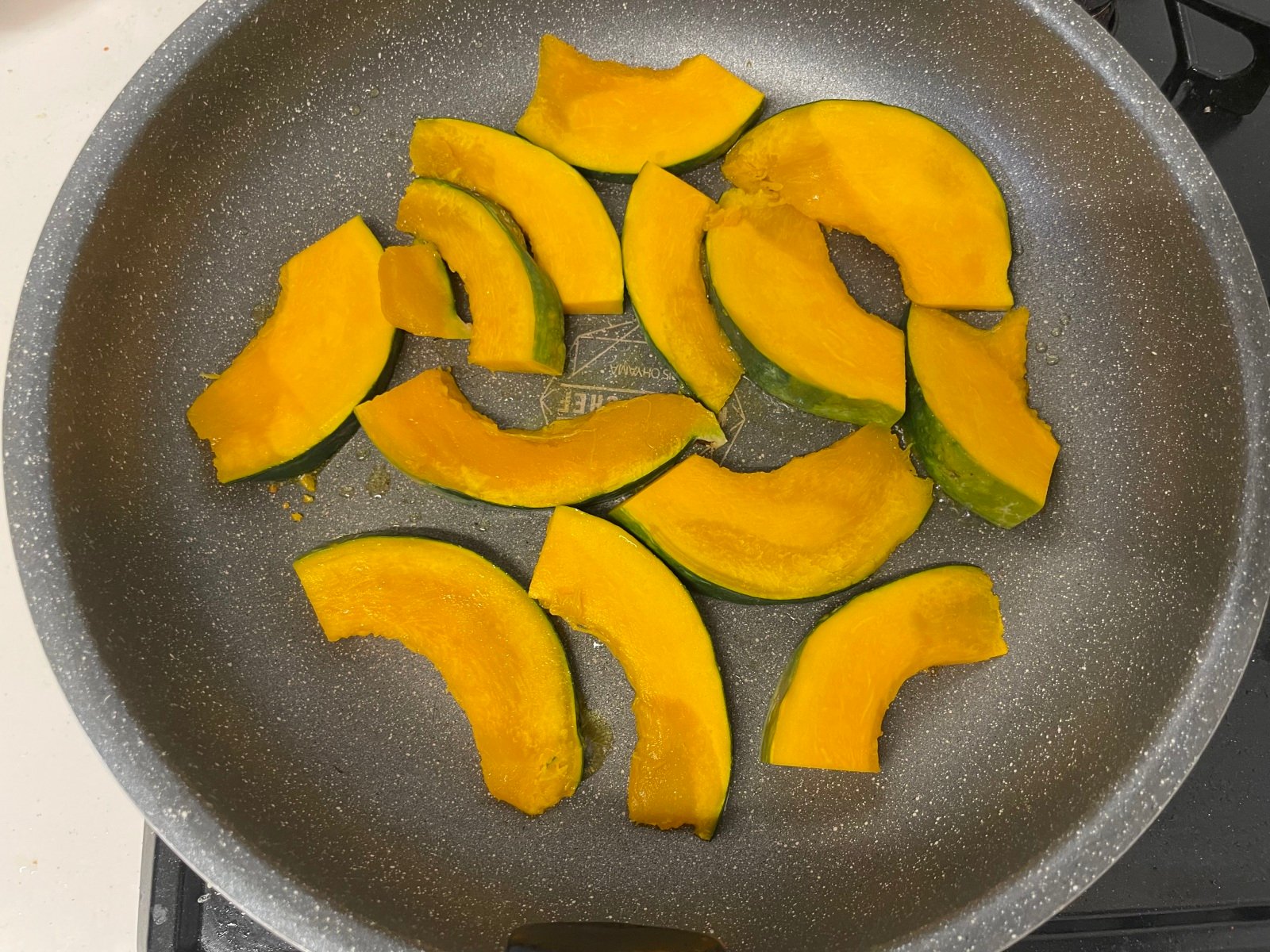 1.中火で熱したフライパンにかぼちゃを入れて両面に焼き色がつくまで焼きます。