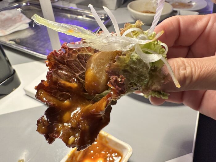 次はキムチやナムルと一緒にレタスに巻いていただきます。