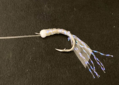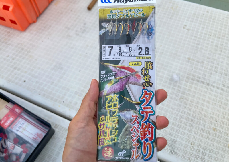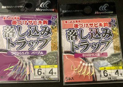2種類目はサバ皮やホロシールなどがハリに付いた仕掛で、擬似餌の色と滑らかな動きが、ベイトフィッシュの食性を刺激しアピールしてくれます。