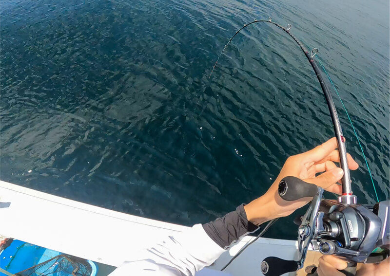 ボトム付近でヒットした場合は根に潜られる可能性があるので、フルドラグで素早く手巻きで引き上げます。中層まで浮かせたら、ハリが外れないよう少しドラグを緩めてファイトを開始します。何が釣れるか直前まで分からないので、期待に胸を膨らませながら大物をキャッチしてください。