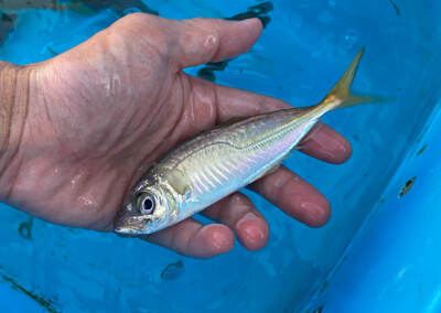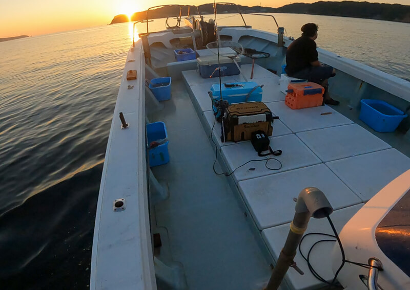先日の釣行では「魚勘丸」さんにお世話になり、9月上旬に伊勢湾の的矢沖でタテ釣りを楽しんできました。しかし当日は、前日の台風の影響で沖合のベイトとなるイワシが散ってしまった様子。掛かりが悪い状況だったので、湾内でアジを20尾ほどキープしてから沖合に向かいました。