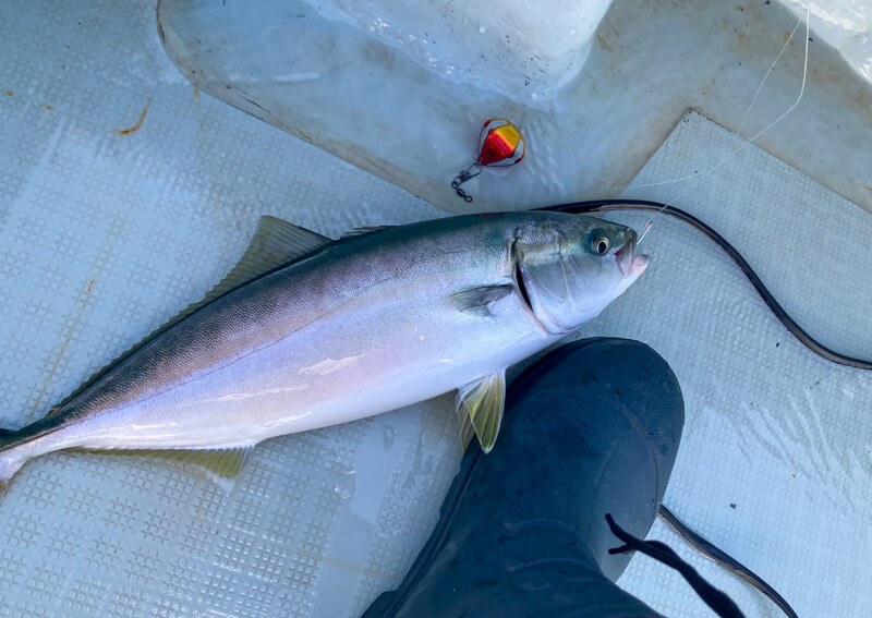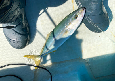 しかしそのあとは、思うような反応を得られなかったので浅場に移動。キープしておいたアジを泳がせると、フォール中に青物がアタックしてきました。はやる気持ちを抑えて、完全に飲み込んだタイミングでフッキングするとヒット。40cmのツバスをキャッチすることができました。