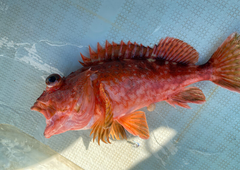 ポイントの水深は51m。オモリは50号を使用して、ボトム付近を回遊するベイトのアジを掛けて大物のアタリを待ちます。すると、着底直後に竿先が大きく曲がってヒット。いきなり良型のカサゴをキャッチすることができました。