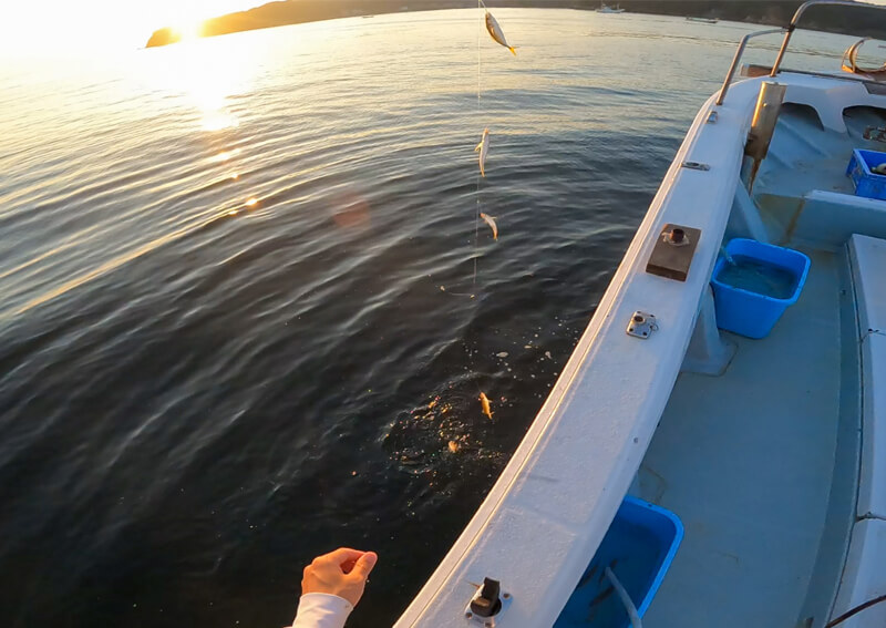 もし、群れが回遊するレンジを通過した場合は、もう一度巻き直してから再度フォールで誘います。ここでベイトがハリに掛かれば竿先がプルプルと震えるので、フォールを止めて様子を見ます。すると、何尾かまとめて掛かってくるはずです。竿にベイトの重みを感じれば準備OKです。