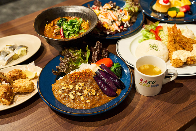 RAKU SPA Station 武蔵小金井 カフェテリアでは、RAKU-SPA薬膳カレーや、骨付きチューリップのジューシーフライ、極みのエビフライプレート、リポスパなど、ととのうヘルシーうまうまメニューがいっぱい♪