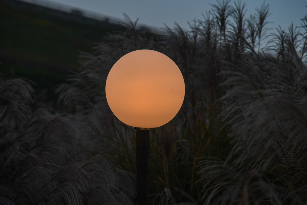 自然にあるものの魅力を引き出すライトアップは、二反田さんたちライトアッパーズの真骨頂。まだ夕陽が残る当初はぼんやりとした印象だったが、時間の移ろいとともに暗闇とのコントラストを映し始めるススキ原っぱ。やがて中心に据えられた球体のランプが満月の役割を成し、まるで中秋の名月を描いた屏風絵のような景観が生み出された。