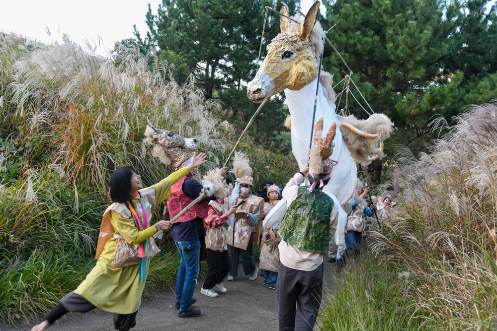 開催期間中、園内には音楽や演劇が観られるテント劇場や花や音楽などに関するワークショップが行われるブースが登場。この日は初日を記念して、本イベントの企画を主導した松本雅隆さん率いる「ロバの音楽座」が、ススキ原っぱまでパレードを披露した。