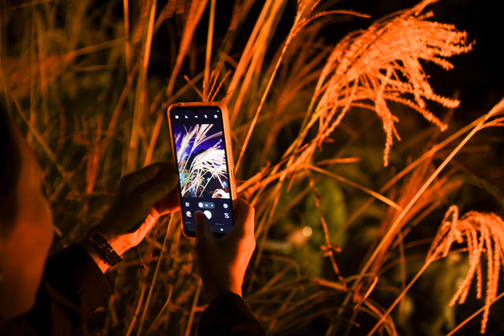 少し遠くから楽器の音色がささやかに届く中、ライトアップされたススキの草原に囲まれる時間は、ちょっとした“異世界体験”。道ゆく人からは「きれい」の歓声が漏れ、その景色をスマホの中に収めようとする人の姿も目立った。