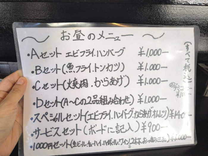 お昼のメニューはエビフライやハンバーグ、唐揚げなど美味しそうなものばかりで価格はなんと税込1,000円ジャスト!!なんでも値上げ値上げのこのご時世ありがたい限りです。